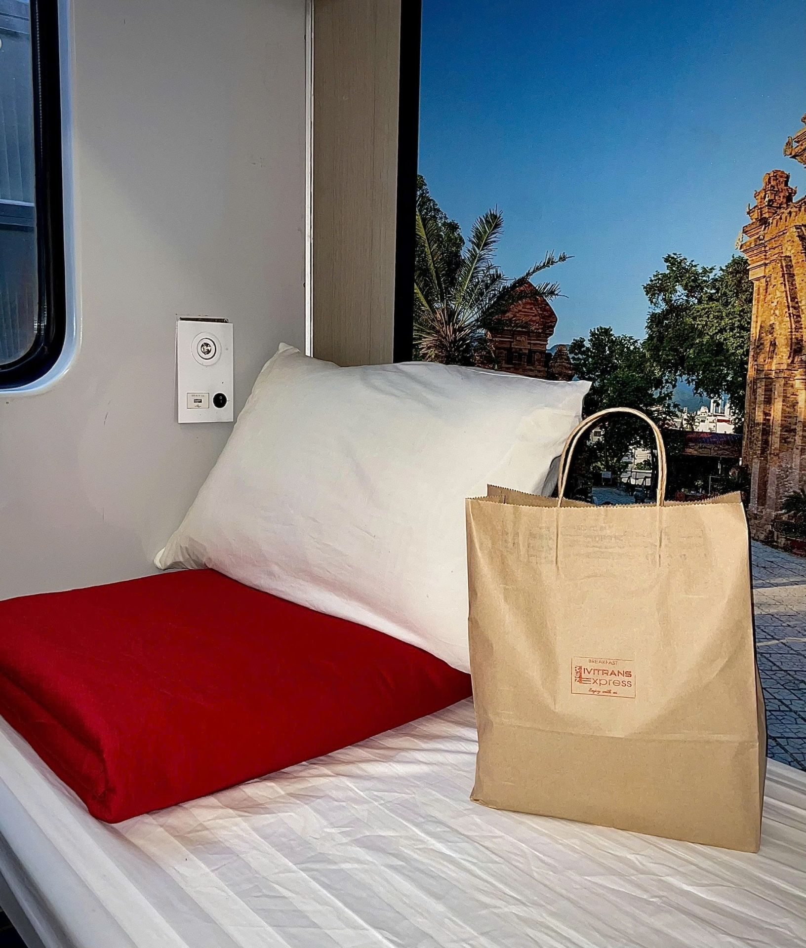 Trang bị wifi, ổ cắm, đèn đọc, rèm riêng, nước suối và chăn ga mới.
